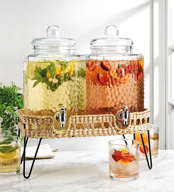Triple glass beverage dispensers on a metal wire rack