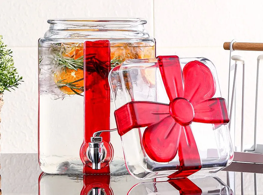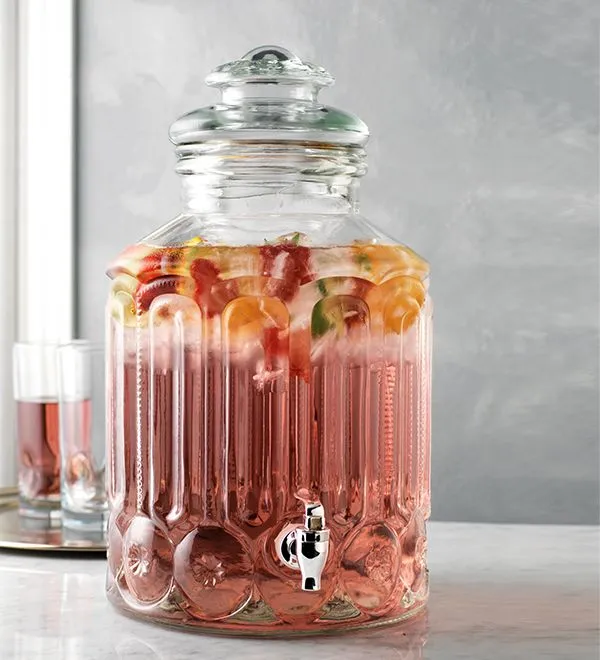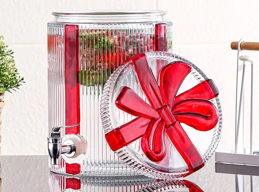 Glass beverage dispenser with ceramic pedestal base and ceramic knob
